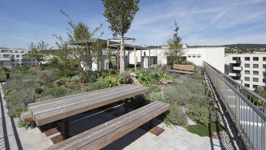Im großzügigen Freibereich der Wohnhausanlage „ParkBLICK“ stehen ein Spielgarten, ein Picknickbereich und einen Pocket-Park zur Verfügung.