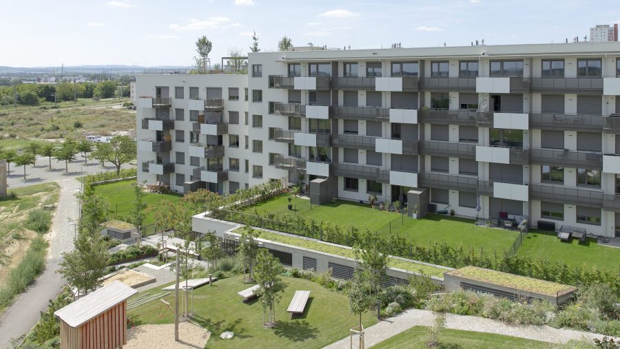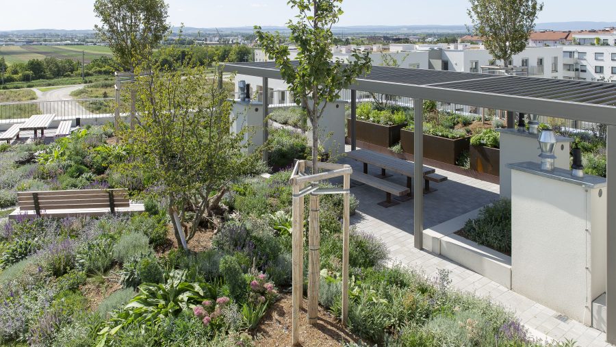 Bei dem innovativen Wohnhausprojekt „ParkBLICK“ auf dem Areal Kirchäcker Ost in Eisenstadt, das einen nutzbaren Dachgarten und ein wertvolles Dachbiotop mit Nistkästen und insektenfreundlichen Pflanzen für mehr Natur- und Artenschutz bietet, sind von der „B-SÜD“ neben 108 Mietwohnungen auch 23 frei finanzierte Eigentumswohnungen im Dachgeschoß errichtet worden. Ergänzt um eine Tiefgarage ist die Wohnhausanlage zentrumsnah in unmittelbarer Nachbarschaft zum Stadtteilpark entstanden und überzeugt neben ihrem ökologischen Konzept vor allem durch ihre hochwertige Ausführung.