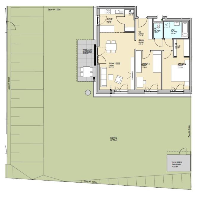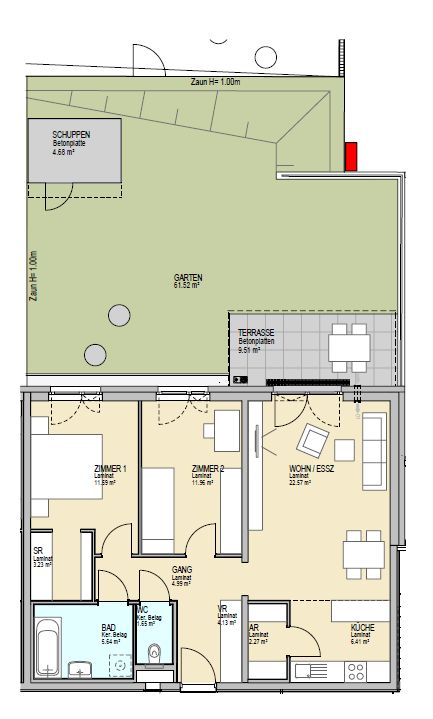 Der Wohnungsmix besteht aus 2- und 3-Zimmer-Wohnungen mit ca. 51 bis 83 m² Wohnfläche. Die Erdgeschoßwohnungen verfügen über einen Garten mit Terrasse und Gerätehütte, die Wohnungen im Obergeschoß haben einen überdachten Balkon.